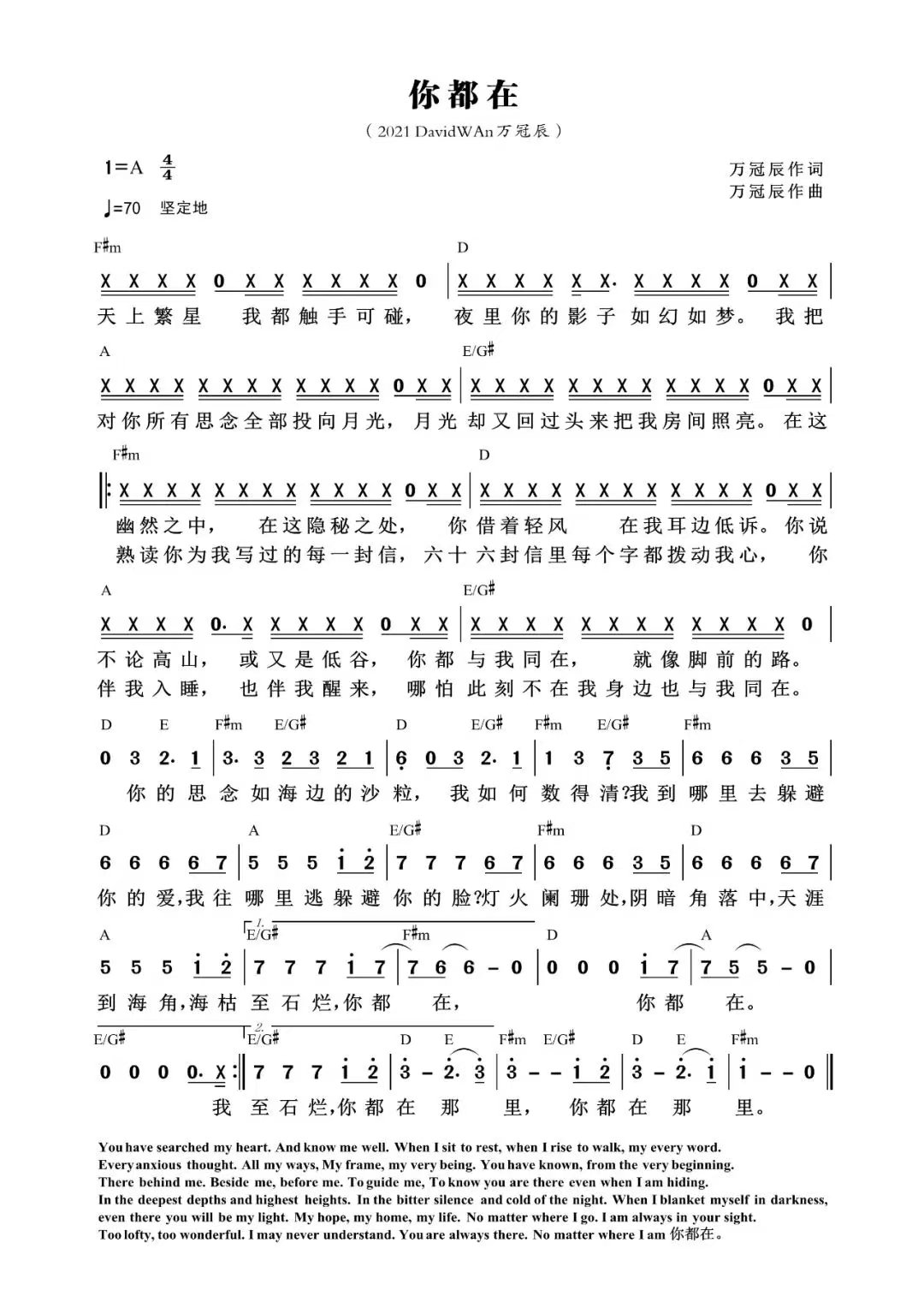 You have searched my heart,And know me well. When I sit to rest, when l rise to walk, my every word. Every anxious thought, All my ways, My frame, my very being, You have known, from the very beginning. There behind me. Beside me, before me.  To guide me, To know you are there even when I am hiding.In the deepest depths and highest heights, In the bitter silence and cold of the night. When I blanket myself in darkness,  even there you will be my light,My hope,my home,my life. No matter where i go, l am always in your sight. Too lofty, too wonderful, I may never understand. You are always there,No matter where l am 你都在。