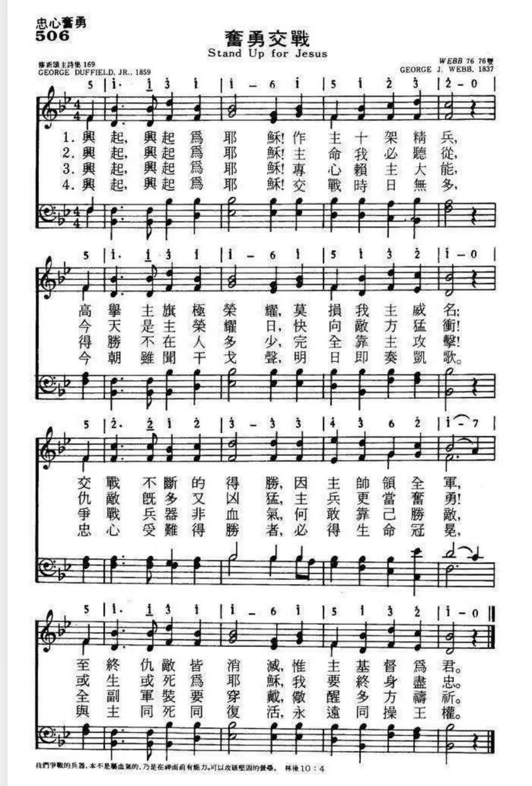 谁会想到这首活泼、雄壮、激昂的圣诗,却是邓斐德(George DuffieldJr., 1818-1888)为悼念他的挚友丁达礼(Dudley Tyng)而作的挽歌。丁达礼的祖父是圣公会主教,父亲是圣公会牧师。