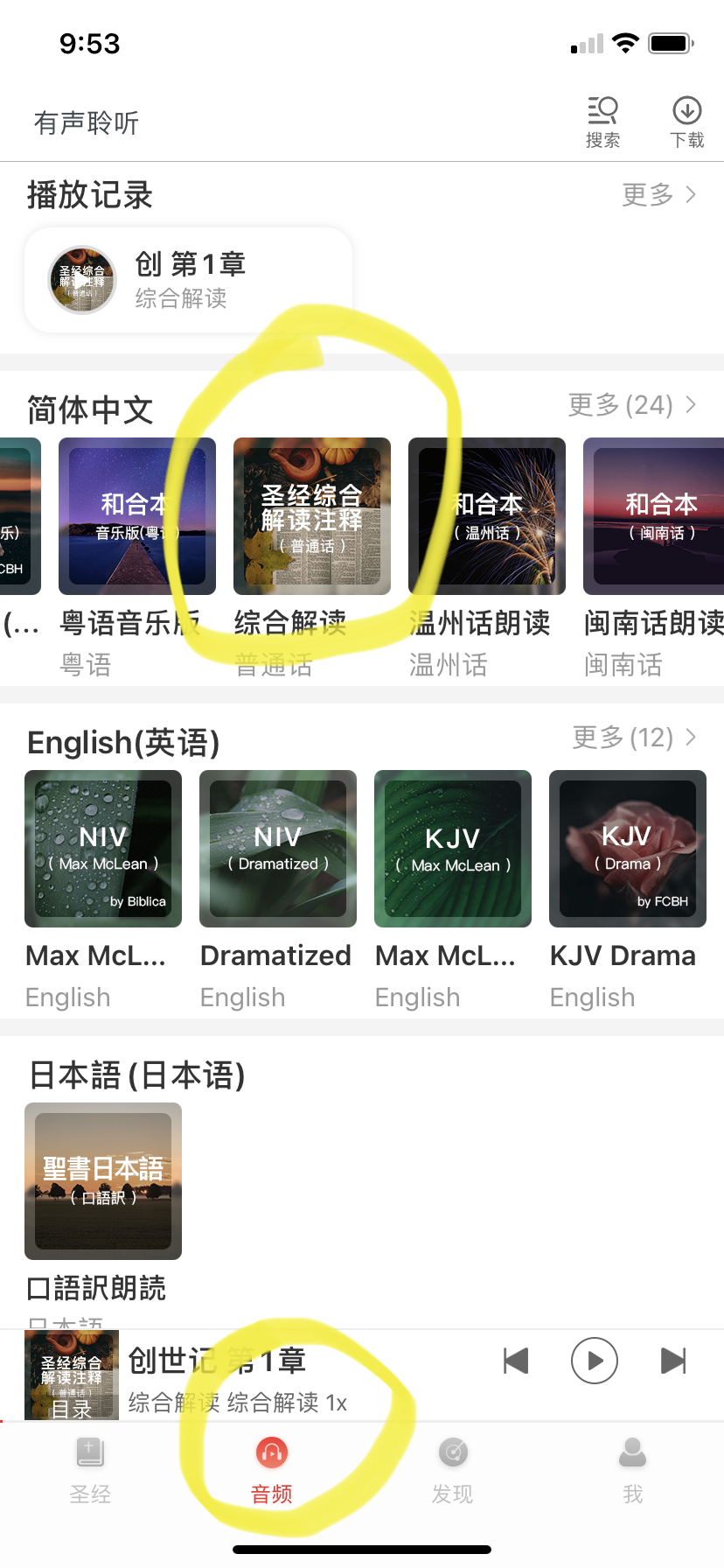 点击主画面下方的「音频」,可以进入音频板块,找到《圣经综合解读》,逐卷下载全部音频文件。以后不必上网,就可以聆听朗读,并且可以调节播放速度。