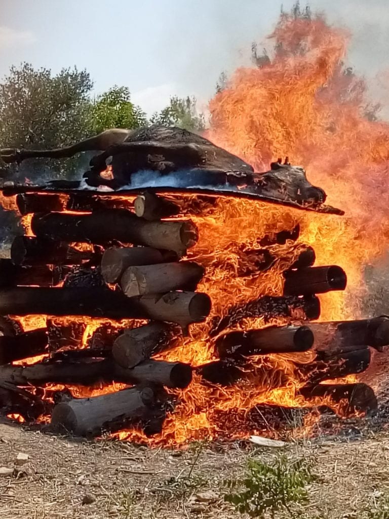 上图:为了预备制作红母牛灰,2019年8月,以色列圣殿研究所按照古代的方法实际焚烧了一只成熟的母牛,并发布了研究结果。这个实验使用了1.4吨松树、橡树和无花果树的木头做成的柴堆,以及古代常见的巴拉迪(Baladi)品种母牛。燃烧了大约九个小时后,产生了66公斤灰烬,其中母牛骨灰大约11公斤,制作成的洁净水可以洒6600亿次。研究报告指出,燃烧红母牛最好的木材是无花果树,容易点燃、灰烬细腻,几乎不需要筛滤。