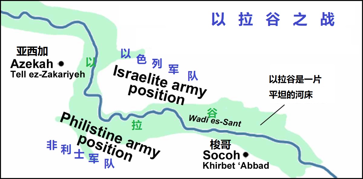 - 「以拉谷」(2节)是从迦特通往希伯仑和伯利恒的主要道路,两边是丘陵,两军隔谷对峙。「当中有谷」(3节),指有一条季节性的河道。