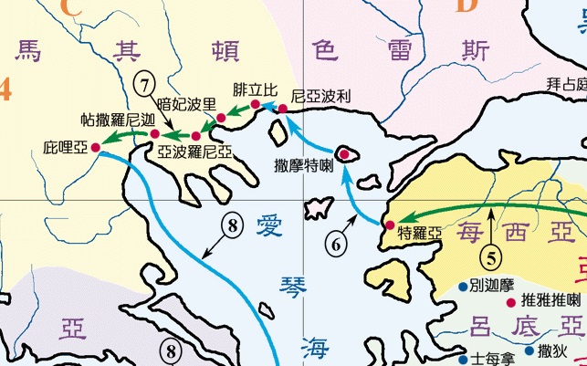 上图:保罗经过弗吕家加拉太向西到了每西亚的边界,圣灵禁止他们往南边的亚细亚省讲道(徒十六6),又不许他们往北边的庇推尼省(徒十六7),所以他们只能向西直行穿过每西亚,到达地中海边的特罗亚港(徒十六8)。