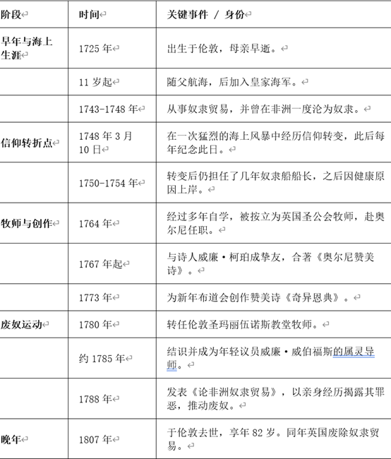 约翰·牛顿的一生极具传奇色彩,从贩卖奴隶的船长,转变为创作出《奇异恩典》的牧师,并最终成为影响深远的废奴主义者。以下是他的生平关键信息概览: